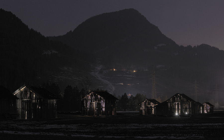 The installation is situated along the field lane on the valley floor of Prättigau. The one-chamber barns are illuminated from the inside.