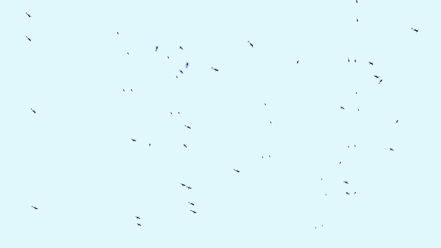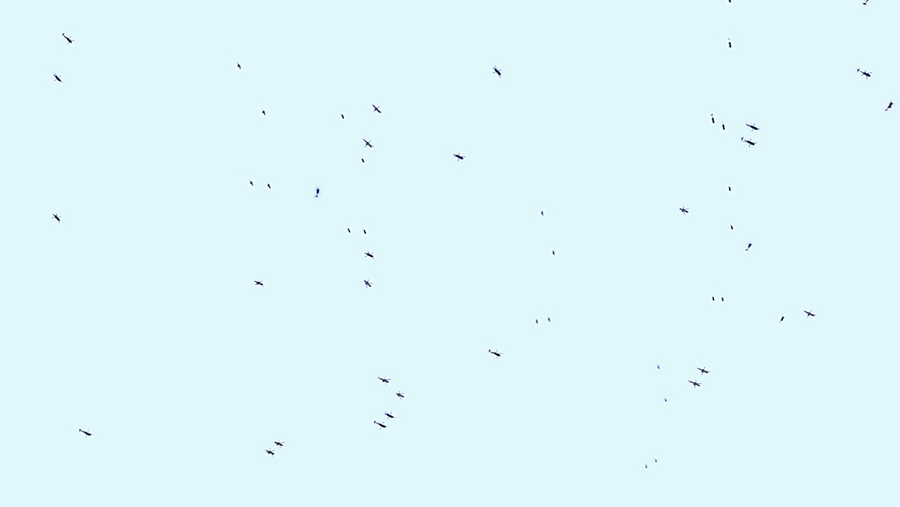 Helicoptres in couples pass on the screen in a moving standstill.