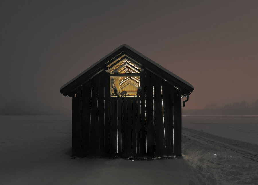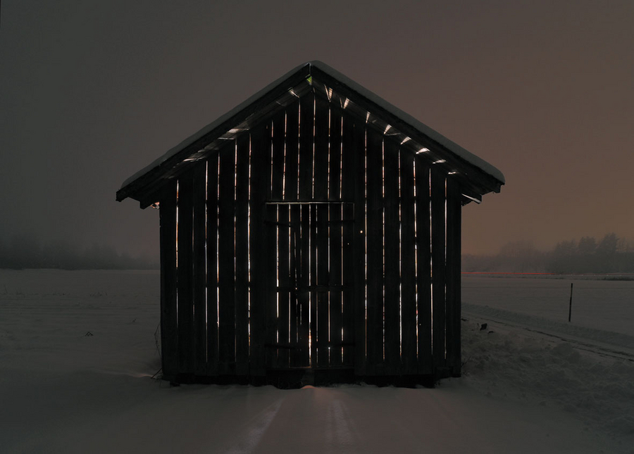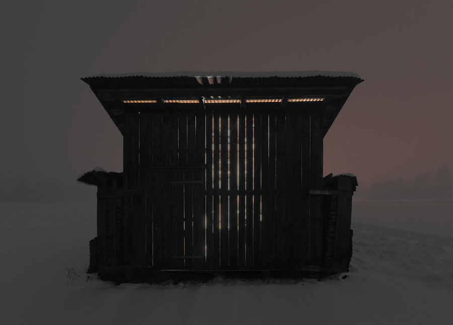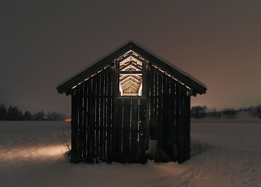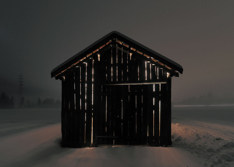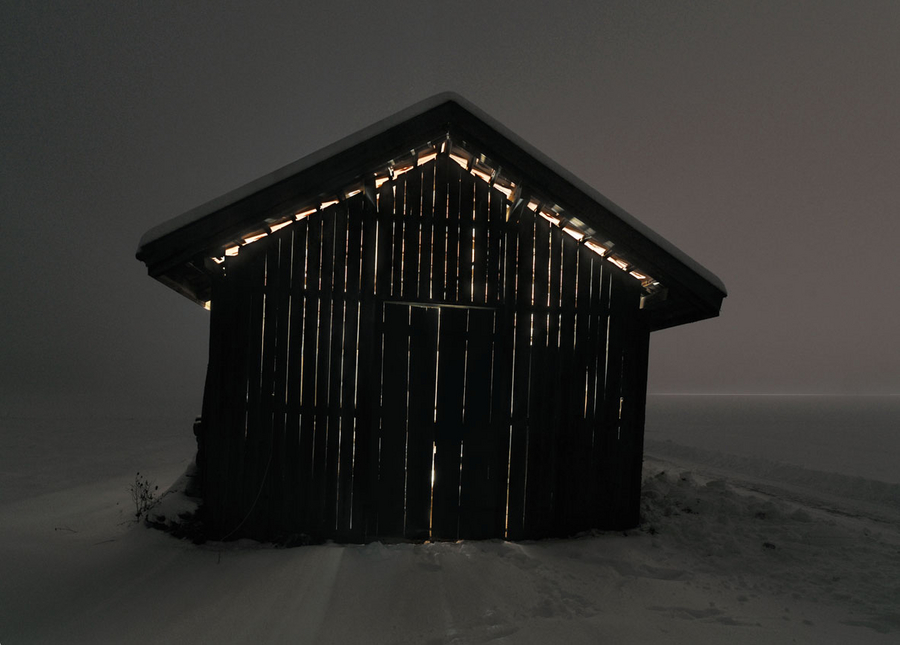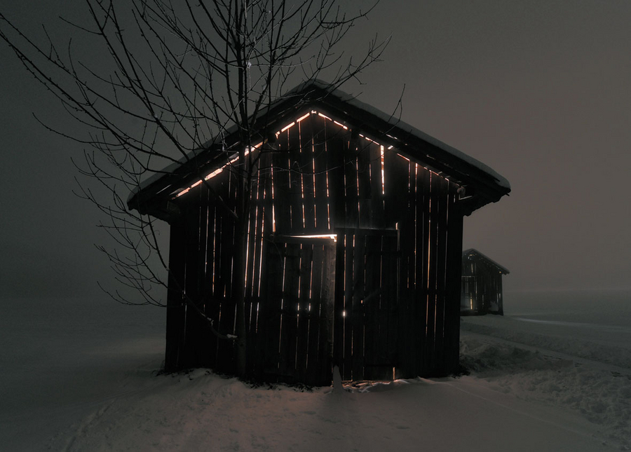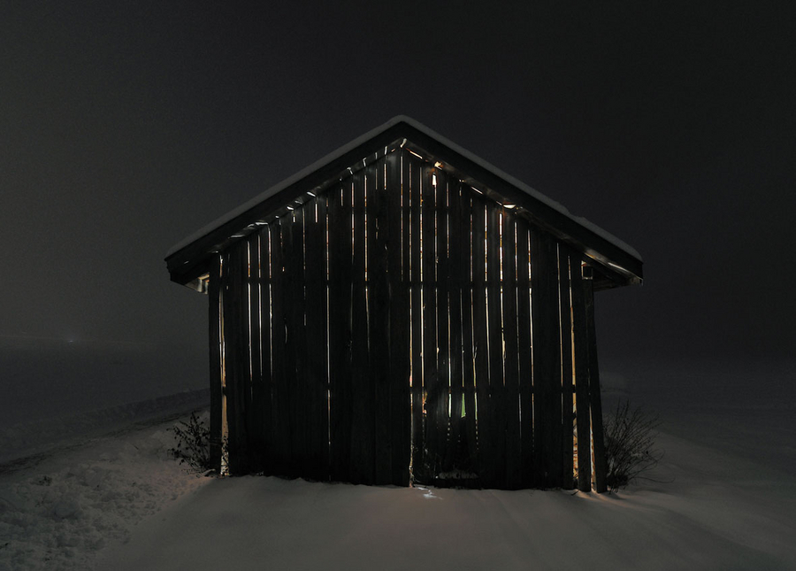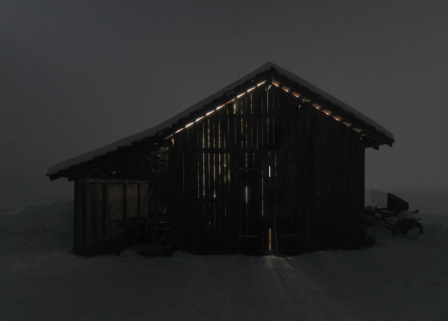 Avenue consists of 17 pictures, which show barns from the front side on the GrĂ¼scher Schwellen. The one-chamber barns are illuminated from the inside.